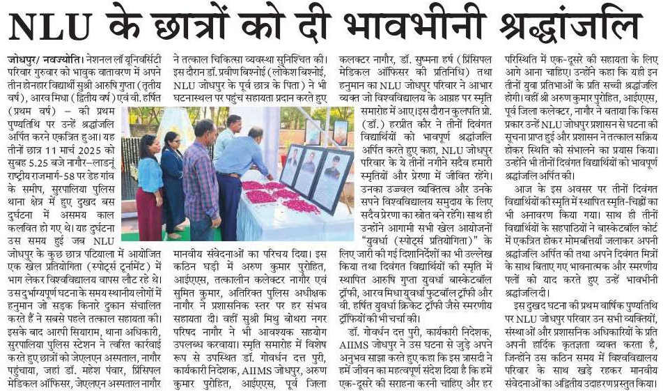 Three Bright Gems Will Forever Live in the Memories of NLU Jodhpur – University Family Pays Heartfelt Tribute